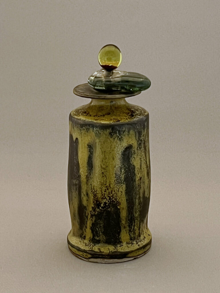 j’aime enrichir mes bouteilles en y ajoutant des bouchons de verre façonnés au chalumeau selon la technique de Murano , afin de créer un contraste poétique entre la terre et l’éclat du verre .